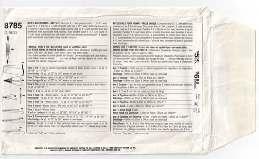 Patrón de costura vintage de los años 80 Simplicity 8785 para accesorios formales de boda, graduación, corbatas, fajas, etc., talla única, sin cortar, doblado de fábrica