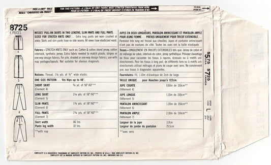 Simplicity 8725 Womens EASY Stretch Knit Pants & Skirts 1980s Vintage Sewing Pattern ONE SIZE UNCUT Factory Folded