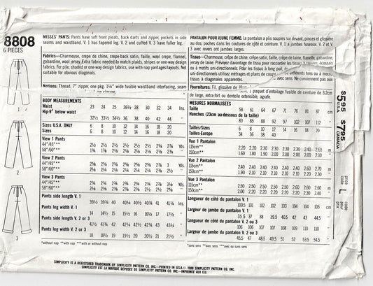 Simplicity 8808 Womens Custom Fit Pleated Pants 1980s Vintage Sewing Pattern Size 6 - 12 UNCUT Factory Folded