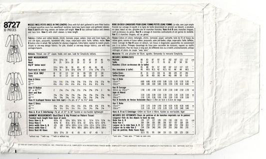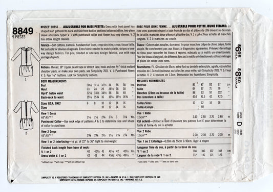 Patrón de costura vintage de los años 80 para vestido de talle bajo con frunces laterales Simplicity 8849 BELLE FRANCE, talla 14, doblado de fábrica