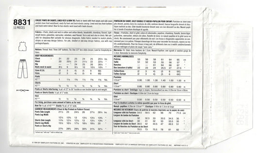 Simplicity 8831 Boys Formal Wear Lined Vest Pants Shorts & Tie 1990s Vintage Sewing Pattern Size 5 -6X UNCUT Factory Folded
