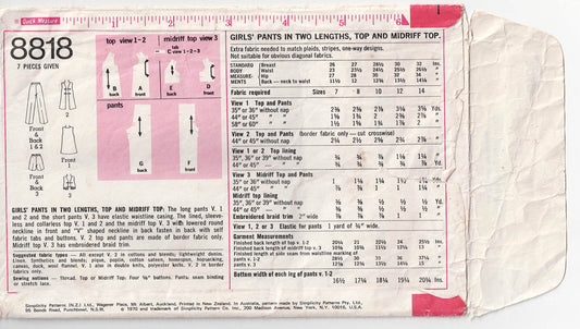Patrón de costura vintage de los años 70 para pantalones cortos y top con abertura en el abdomen para adolescentes Simplicity 8818, talla 12