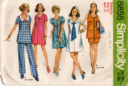 Patrón de costura vintage de los años 70 para vestido de maternidad de mujer Simplicity 8855, túnica, pantalones cortos y pantalones, talla 12, busto 34 pulgadas