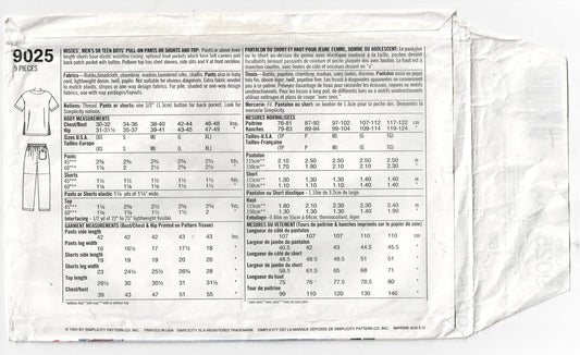 Patrón de costura vintage de los años 90 Simplicity 9025 para mujer, hombre, adolescente, unisex, caftán, pantalones cortos o cargo, tallas XS a M, sin cortar, doblado de fábrica