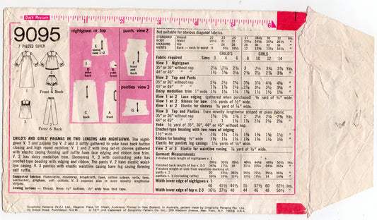 Patrón de costura vintage de los años 70 para camisón y pijama para niñas Simplicity 9095, talla 6