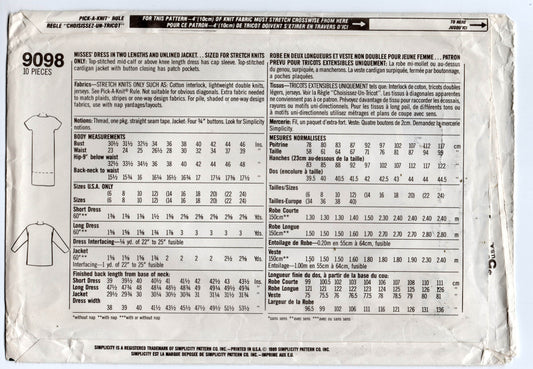 Patrón de costura vintage de los años 80 para vestido y chaqueta tipo cárdigan elásticos JIFFY para mujer de Simplicity 9098, talla 6-12, sin cortar, doblado de fábrica