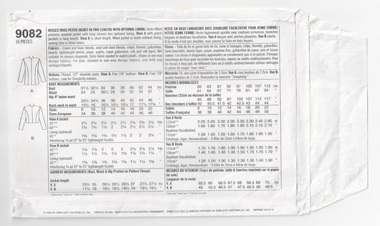 Simplicity 9082 EASY 3 Hour Womens Collarless Princess Seamed Jacket with Optional Lining 1990s Vintage Sewing Pattern Size 12 - 18 UNCUT Factory Folded