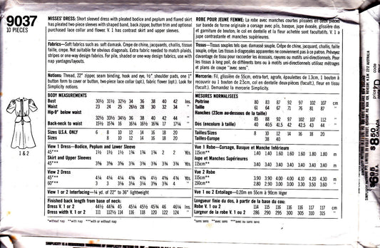 Patrón de costura vintage de los años 80 para vestido de fiesta con peplum Simplicity 9037 BELLE FRANCE, talla 10, doblado de fábrica