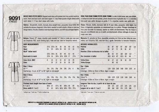 Patrón de costura vintage de los años 80 para vestido de talle bajo con corpiño moldeado Simplicity 9091 BELLE FRANCE, talla 10, doblado de fábrica