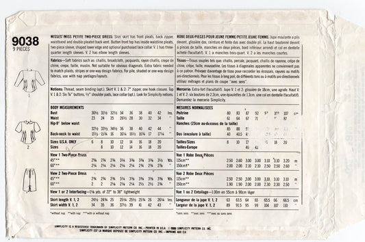 Patrón de costura vintage de los años 80 para mujer Simplicity 9038 BELLE FRANCE, top y falda peplum, talla 12, sin cortar, doblado de fábrica