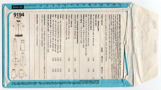 Patrón de costura vintage de los años 80 para muñecas de 11 1/2 pulgadas, sin cortar, doblado de fábrica, Simplicity 9194, ropa para muñecas BARBIE para adolescentes