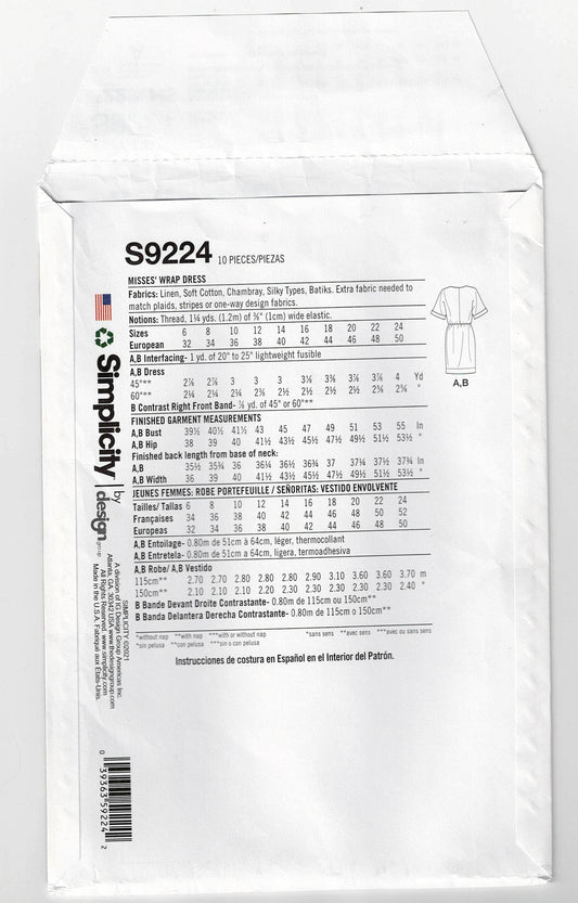 Patrón de costura para vestido cruzado estilo kimono para mujer Simplicity 9224 MIMI G STYLE, talla 6-14, sin cortar, doblado de fábrica