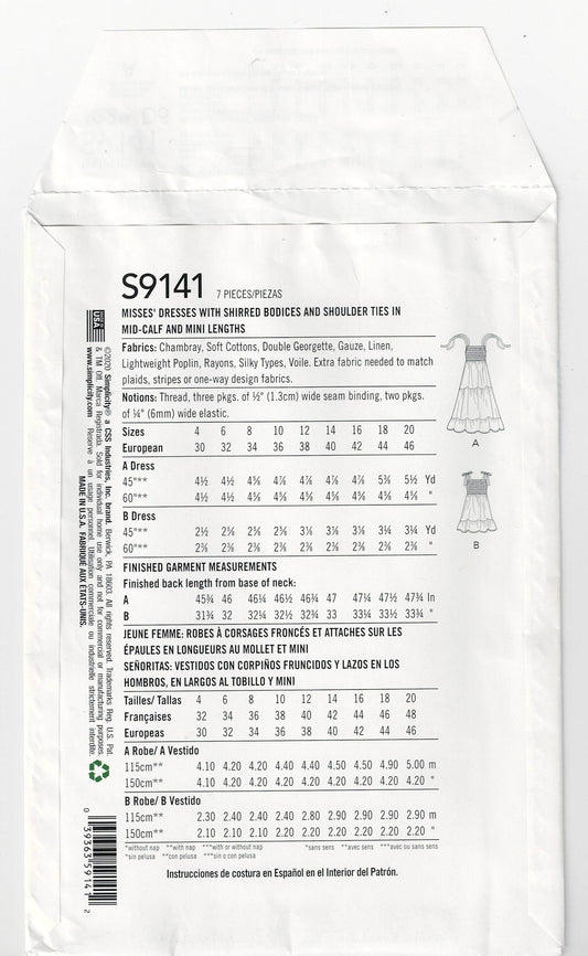 Simplicity 9141 CYNTHIA ROWLEY Womens Shirred Bodice Tiered Skirt Mini Dress or Sundress Out Of Print Sewing Pattern Size 4 - 12 UNCUT Factory Folded