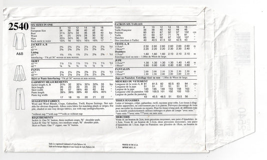 Style 2670 Womens Jacket Vest Pants & Skirt 1990s Vintage Sewing Pattern Size 8 - 18 UNCUT Factory Folded
