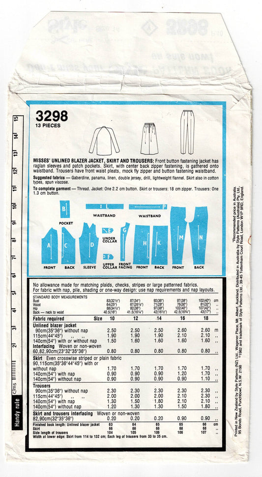 Patrón de costura vintage de los años 80, estilo 3298, para chaqueta, pantalón y falda ajustada para mujer, talla 14, sin cortar, doblado de fábrica