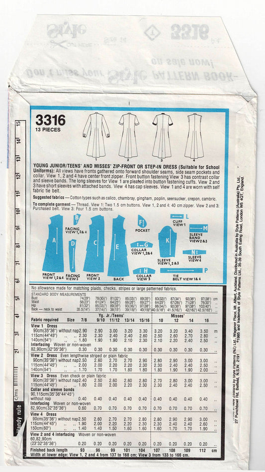 Patrón de costura vintage de los años 80, estilo 3316, para vestido camisero con cierre de cremallera o botón, talla 14, busto de 36 pulgadas, sin cortar, doblado de fábrica