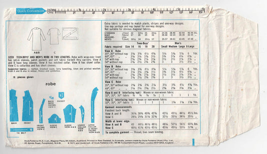 Style 3259 Mens Dressing Gown / Bath Robe in 2 Length 1970s Vintage Sewing Pattern Size 38 - 40