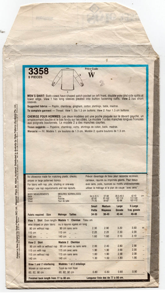 Patrón de costura para camisa clásica de hombre estilo 3358, años 80, talla mediana, pecho 38-40 pulgadas