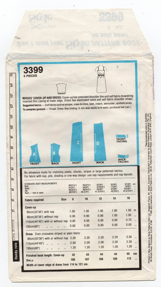 Patrón de costura vintage de los años 80 para vestido y pareo estilo 3399 para mujer, talla 14, busto de 36 pulgadas, sin cortar, doblado de fábrica