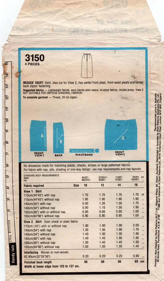 Patrón de costura vintage de los años 80 para falda plisada invertida para mujer, estilo 3150, talla 12, cintura 26,5 pulgadas