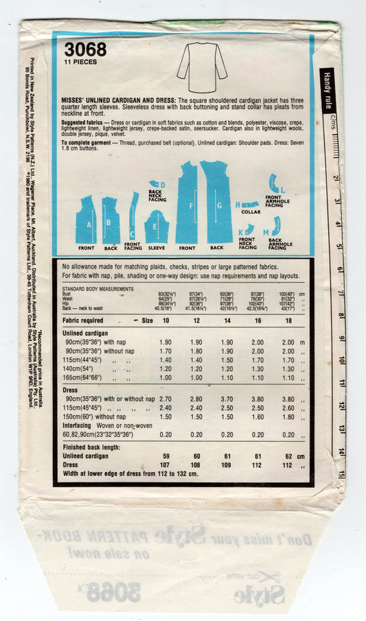 Patrón de costura vintage de los años 80 para vestido y chaqueta tipo cárdigan con botones en la espalda para mujer, estilo 3068, talla 18, busto de 40 pulgadas, sin cortar, doblado de fábrica