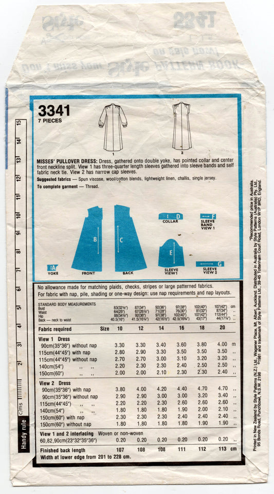 Patrón de costura vintage de los años 80 para vestido de tienda de campaña con hombros fruncidos estilo 3341 para mujer, talla 12, busto de 34 pulgadas