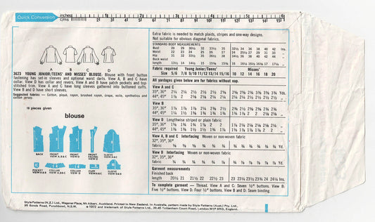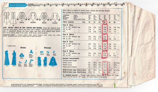 Style 3589 Womens Dress & Blouse 1970s Vintage Sewing Pattern Size 16 Bust 38 inches