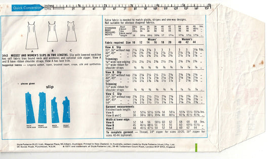 Style 3443 Womens EASY Slip or Dress in 2 Styles 1970s Vintage Sewing Pattern Bust 44 Inches