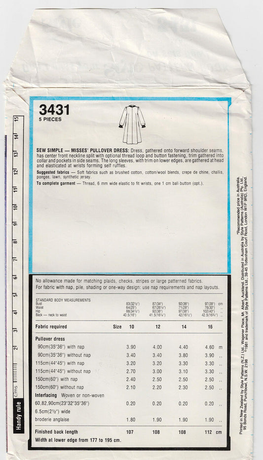 Style 3431 Womens EASY Pullover Smock Dress 1980s Vintage Sewing Pattern Size 16 Bust 38 inches UNCUT Factory Folded