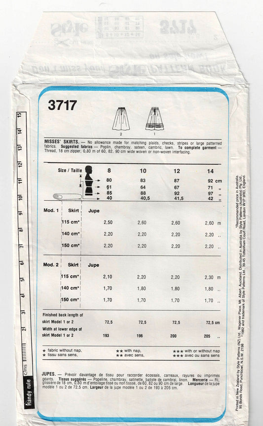 Patrón de costura de faldas fruncidas estilo 3717 para mujer, estilo vintage de los años 80, talla 8 a 14, sin cortar, doblado de fábrica