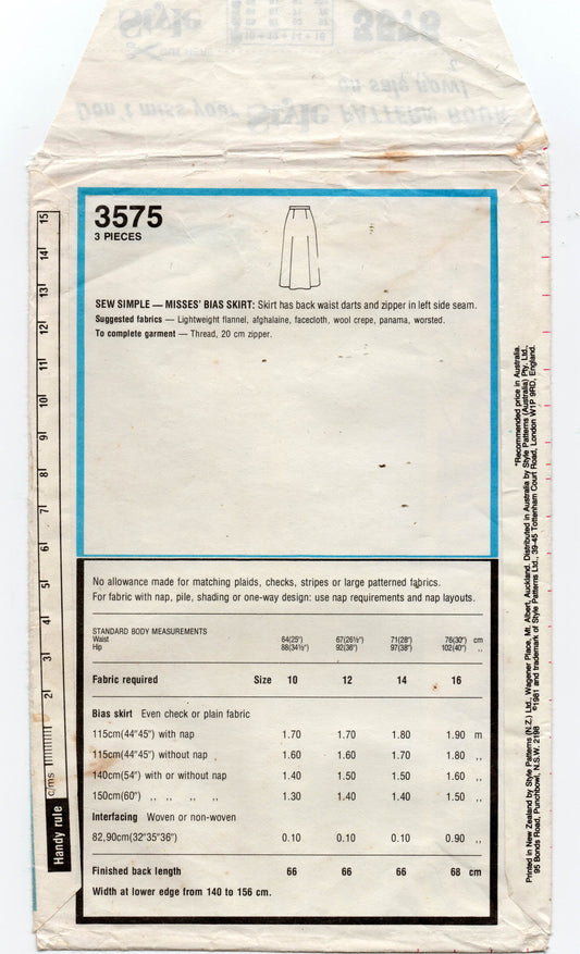 Patrón de costura estilo 3575 para faldas de corte al bies para mujer, estilo vintage de los años 80, talla 10 a 16, sin cortar, doblado de fábrica