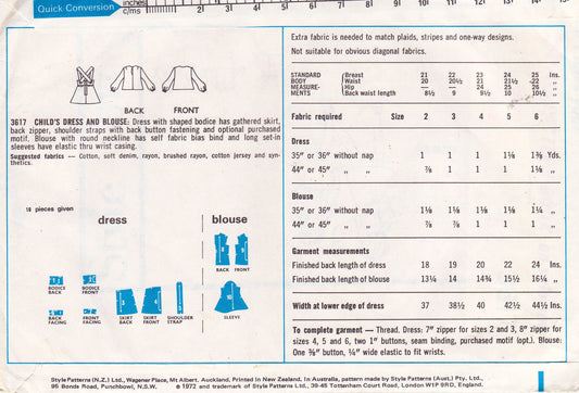 Patrón de costura vintage de los años 70, estilo 3617, para niñas pequeñas, vestido mini en forma de A y blusa con mangas abullonadas, talla 2