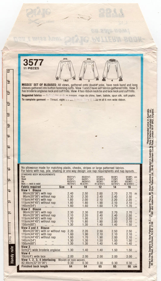 Patrón de costura vintage de los años 80 para blusas románticas con volantes estilo 3577 para mujer, talla 8