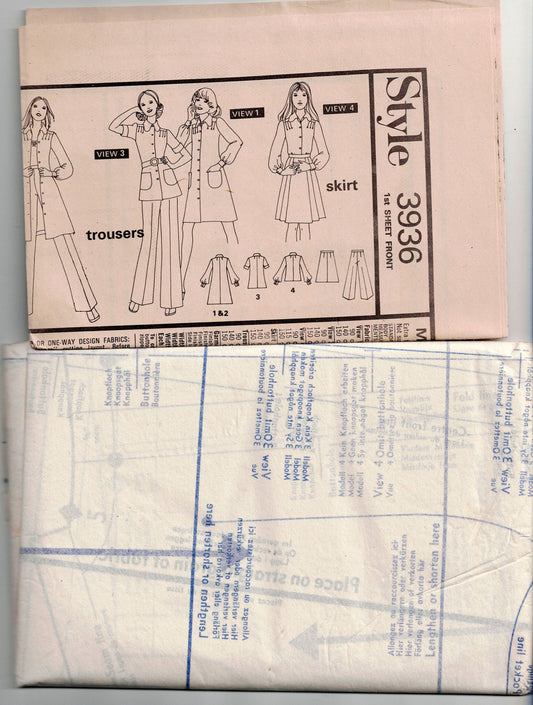Patrón de costura vintage de los años 70, blusa, cárdigan, pantalones y falda para mujer, estilo 3900, talla 14, busto de 36 pulgadas