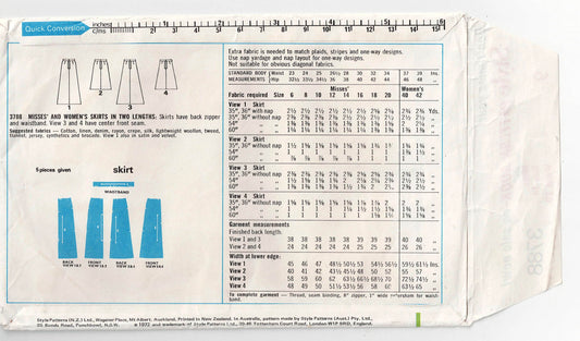 Patrón de costura vintage de los años 70, estilo 3788, faldas para mujer en 2 largos, talla 10, cintura 25 pulgadas