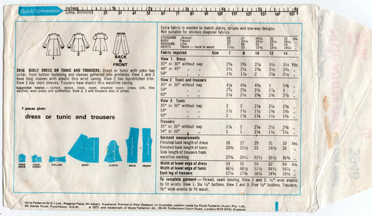 Patrón de costura vintage de los años 70, estilo 3946, vestido, túnica y pantalones con mangas abullonadas para niñas, talla 10, busto 28,5 pulgadas