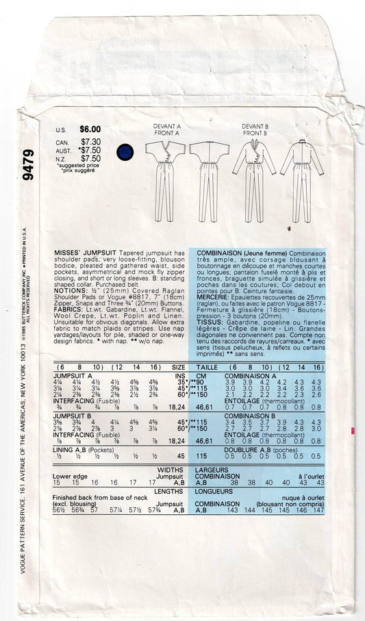 Mono asimétrico con bolsillos para mujer Vogue 9479 Patrón de costura vintage de los años 80 Talla 6 - 10