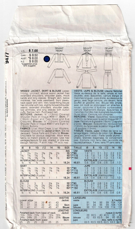 Patrón de costura muy fácil Vogue 9477 para chaqueta corta, falda ajustada y blusa con corbata para mujer, años 80, vintage, talla 12-16, sin cortar, doblado de fábrica