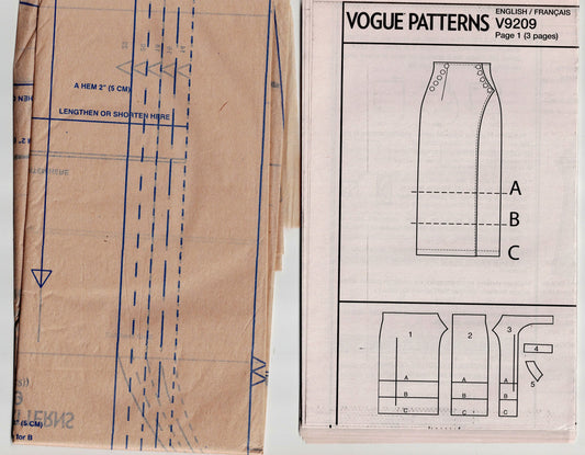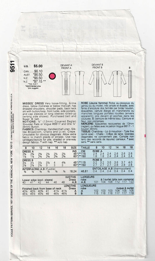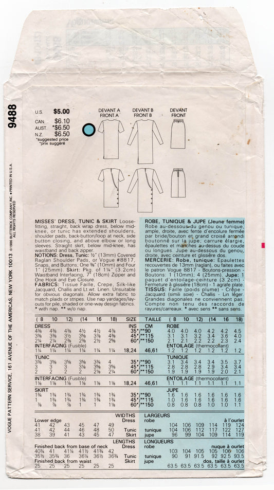 Patrón de costura vintage de los años 80 para vestido de mujer con mangas raglán, cuello y bolsillos, Vogue 9433, muy fácil de usar, tallas 8 y 10