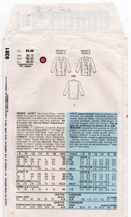 Patrón de costura muy fácil para abrigo de mujer de gran tamaño Vogue 9381, años 80, vintage, talla 14, busto 36 pulgadas