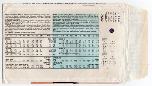 Patrón de costura muy fácil para vestido cruzado de mujer Vogue Career 7582, años 80, vintage, talla 8-12, sin cortar, doblado de fábrica