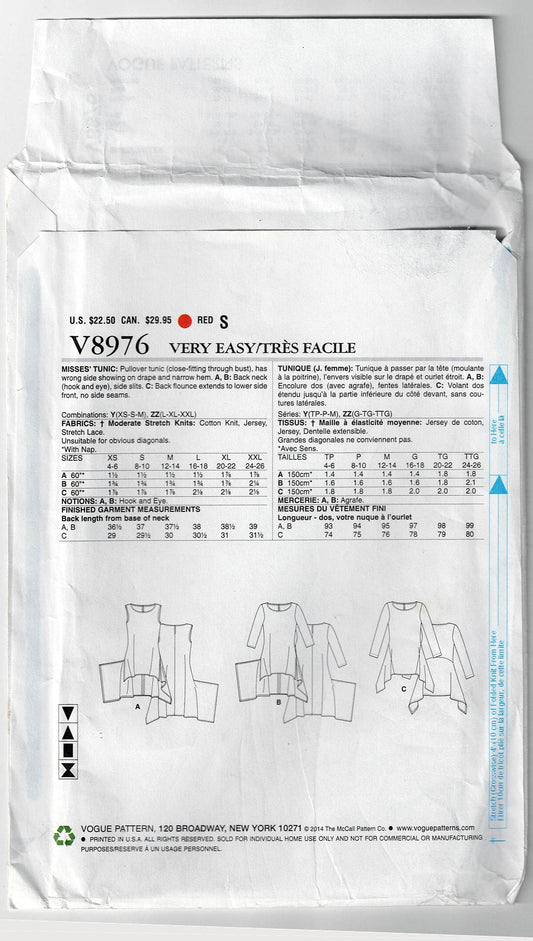 Patrón de costura de túnica con dobladillo con volantes de punto elástico para mujer Vogue 8976, muy fácil de usar, agotado, talla L - XXL, sin cortar, doblado de fábrica