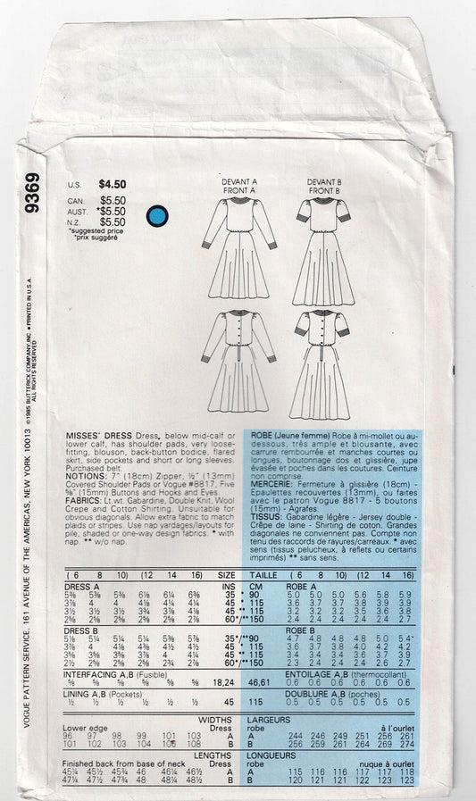 Patrón de costura muy fácil para vestido con mangas abullonadas y botones en la espalda para mujer Vogue 9369, años 80, vintage, talla 6-10, sin cortar, doblado de fábrica