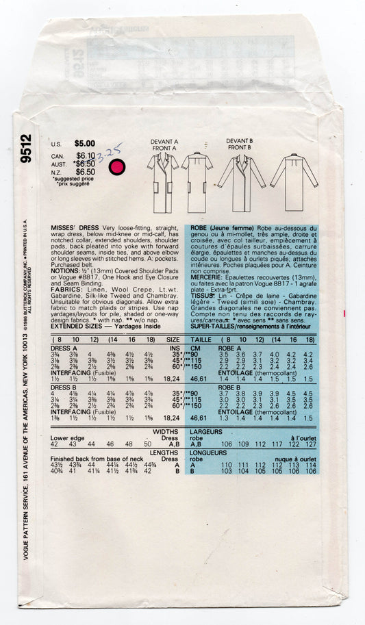 Patrón de costura muy fácil para vestido cruzado de mujer Vogue 9512, años 80, vintage, talla 8-12, sin cortar, doblado de fábrica