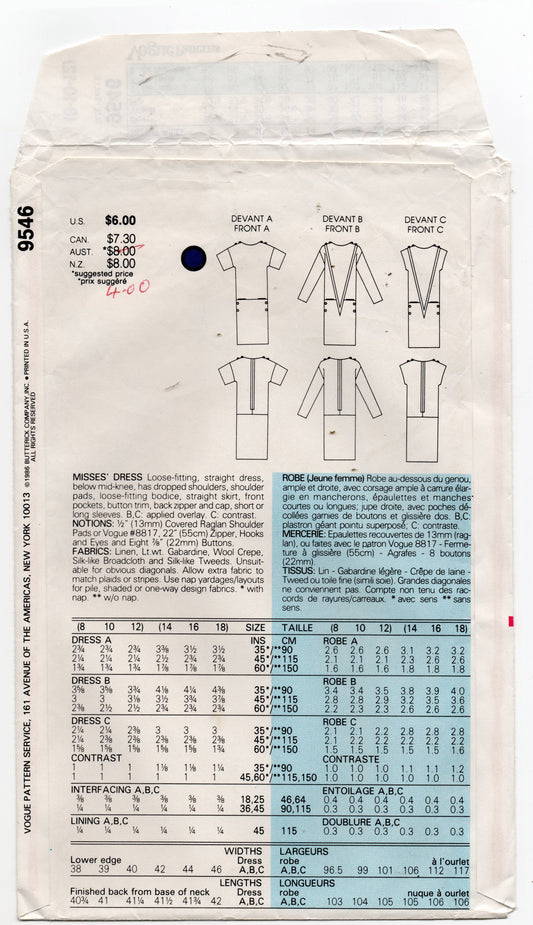 Patrón de costura para vestido con bloques de color y bolsillos para mujer Vogue 9546, muy fácil de usar, estilo vintage de los años 80, tallas 8 y 10
