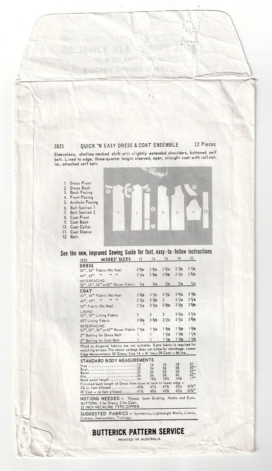 Butterick 3825 Womens Shift Dress & Coat Ensemble 1960s Vintage Sewing Pattern Size 16 Bust 36 inches UNUSED Factory Folded