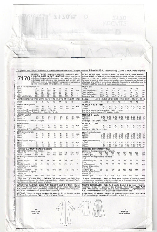 McCall's 7170 Womens Dress Jacket Vest & Skirts 1990s Vintage Sewing Pattern Size 12 - 16 UNCUT Factory Folded