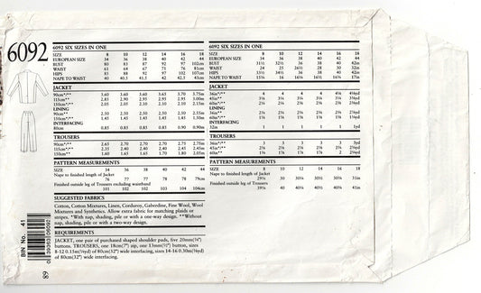 New Look 6092 Womens Loose Fitting Pants Suit 1980s Vintage Sewing Pattern Size 8 - 18 UNCUT Factory Folded
