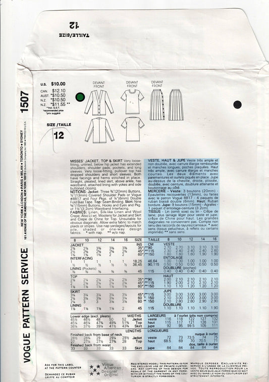 Vogue American Designer 1507 CALVIN KLEIN Womens Jacket Top & Side Buttoned Skirt 1980s Vintage Sewing Pattern Size 12 Bust 34 inches UNCUT Factory Folded