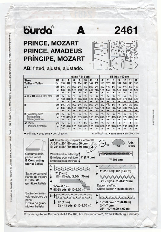 Patrón de costura Burda 2461 para disfraz de "Mozart" o "Príncipe Azul" para niño, agotado, talla 6-12, sin cortar, doblado de fábrica